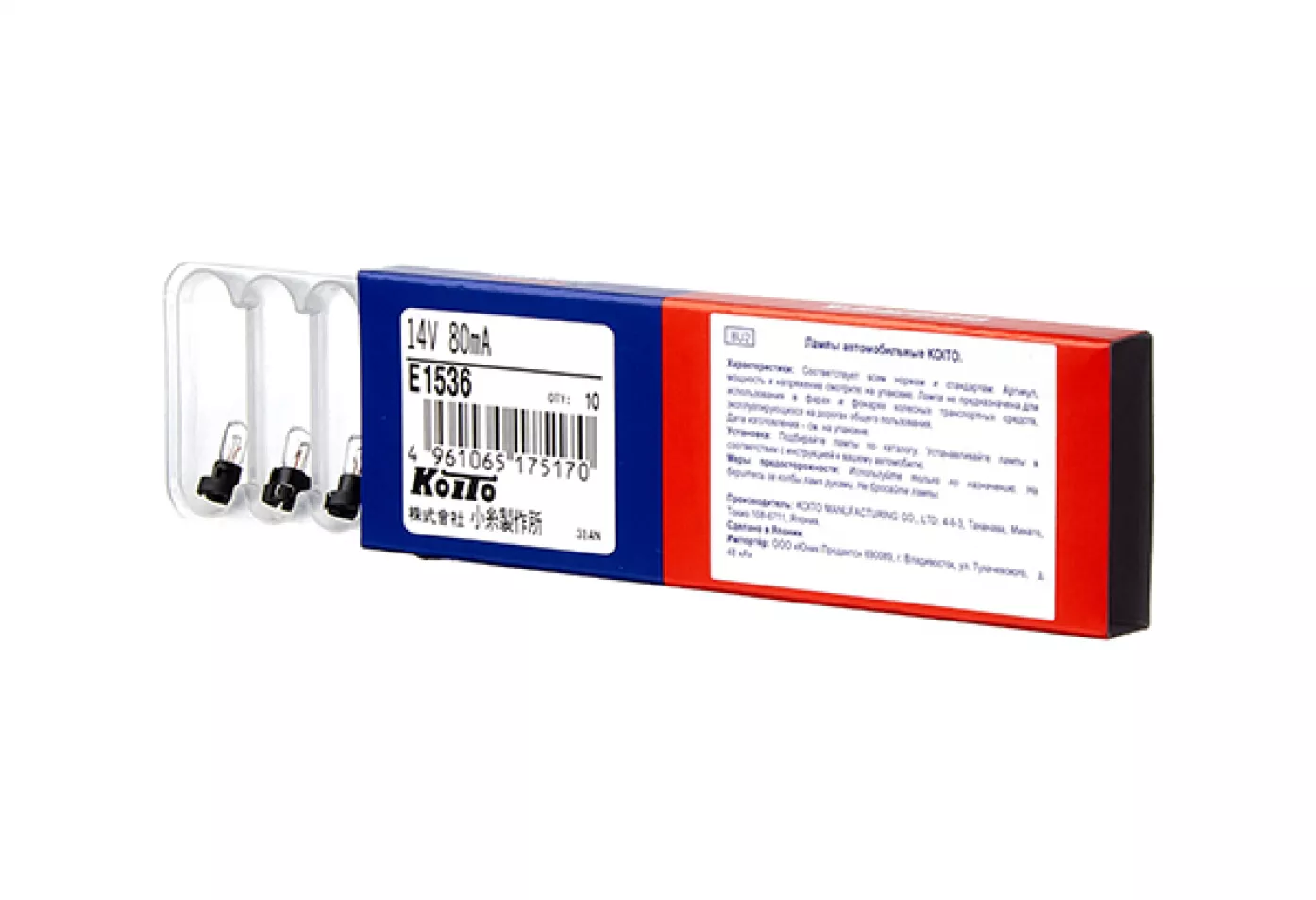 Лампа дополнительного освещения Koito (кратность 10 шт.) - 14V 80mA T4.2 - пластик. цоколь (прозрач.)