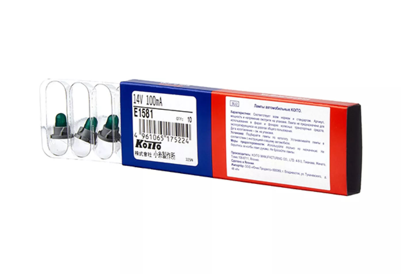 Лампа дополнительного освещения Koito (кратность 10 шт.) - 14V 100mA T4.8 - пластик. цоколь (зеленый)